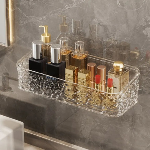 Die strukturierte Oberfläche spielt mit den Lichtstrahlen, ein Hauch von geschliffenem Glas, das eine einfache Ablage in ein luxuriöses Detail verwandelt. Die Klebebefestigung bleibt im Hintergrund, keine Schrauben, kein Metall, nur der Eindruck, als würden die Produkte schwerelos an der Wand gehalten. Feuchtigkeit perlt ab, ohne Spuren zu hinterlassen, eine Oberfläche, die immer klar bleibt.