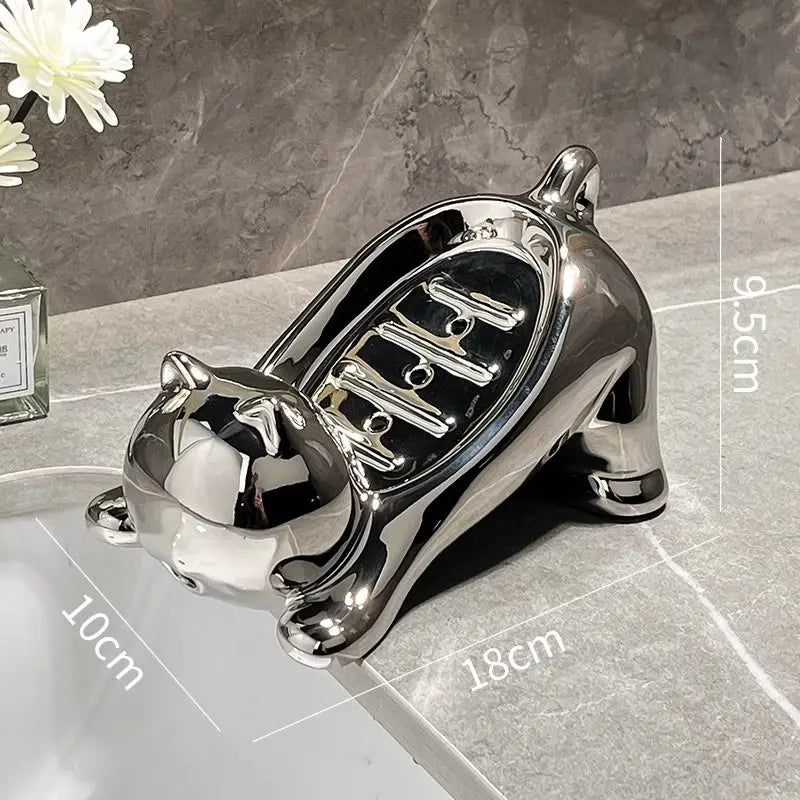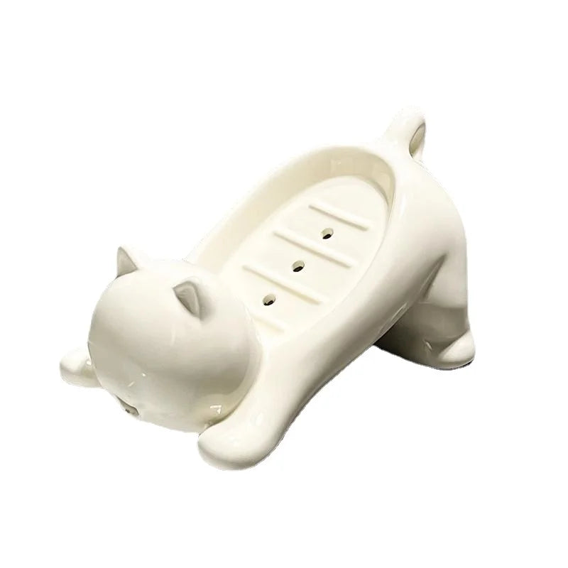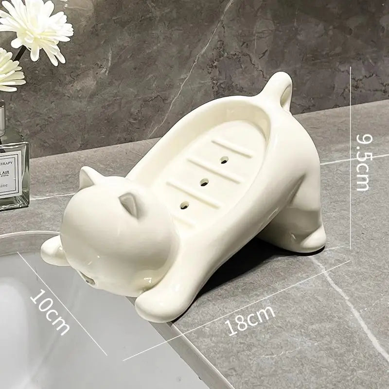 Der leicht gewölbte Boden mit Abflusslöchern sorgt dafür, dass überschüssiges Wasser ablaufen kann und Ihre Seife trocken bleibt. Der kleine Felide wirkt fast lebendig – als würde er Ihre Seife liebevoll beschützen.