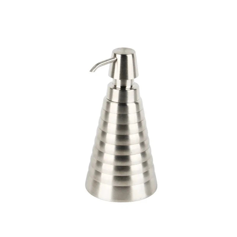 Der Seifenspender Silber ist ein wahres modernes Kunstwerk für Ihr Badezimmer. Seine konische Silhouette aus silbernem Edelstahl, mit eleganten Rillen verziert, schafft eine Tiefe und Bewegung, die sofort ins Auge fällt. Jede Rille reflektiert das Licht auf subtile Weise und verleiht dem gesamten Design einen dezenten Glanz. Dieser skulpturale Stil passt perfekt in moderne Badezimmer oder in Räume mit einem industriellen Touch.